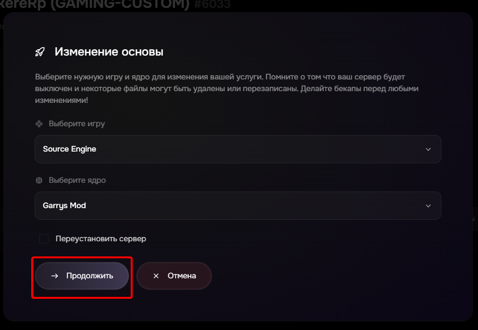 - Чтобы основа начала работать, нужно переустановить сервер. Это можно сделать в модальном окне или в панели управления сервером;